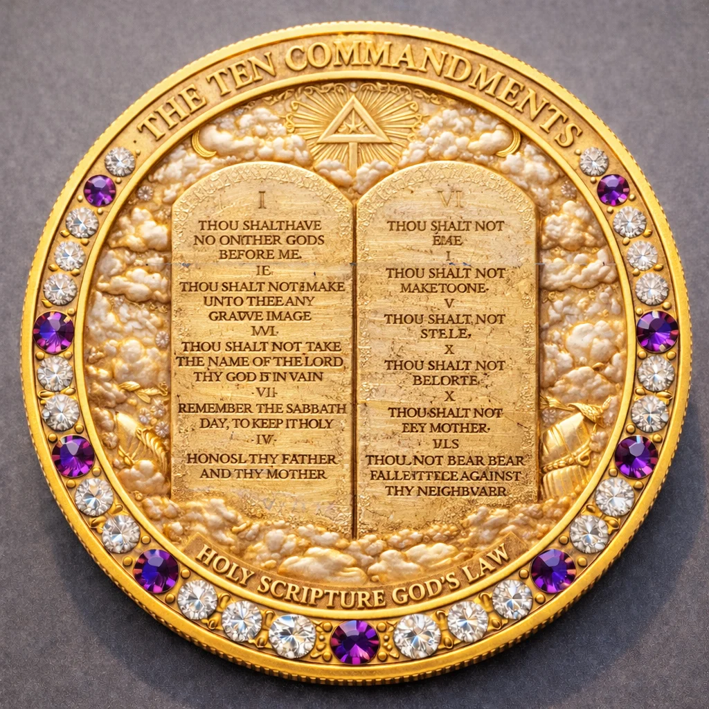 The reverse displays the Tablets of the Ten Commandments, emerging from the clouds beneath the all-seeing glory above — a direct reference to divine authority given by God Himself.